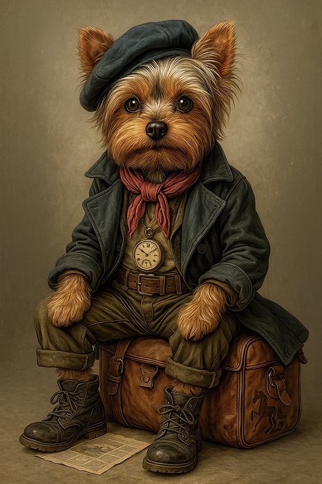 Meet the tiniest traveler with the biggest stories: a sharply dressed Yorkshire Terrier caught between destinations in “Tails from the Train Station.” Perched atop a well-worn leather suitcase, this expressive Yorkie wears a navy beret, a rugged trench coat, and a loosely tied red scarf that flutters with implied motion. His polished boots and pocket watch suggest he's no stranger to the rhythm of the rails, and his wide-eyed gaze captures that wistful moment of waiting — whether for the next train or the next great adventure.